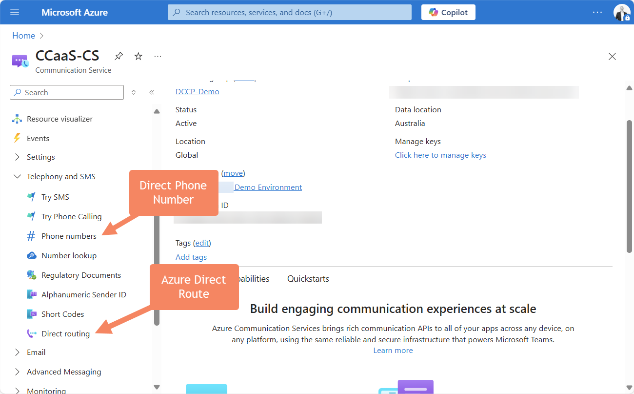 Once an Azure Communication Service instance is deployed in Azure, here’s where you’ll find them: