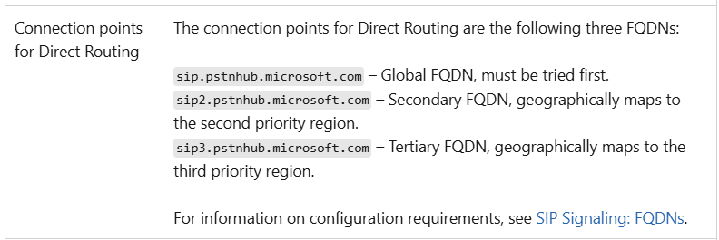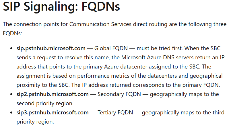 To be honest, adding an addition direct route isn’t too tedious, but it did mean that more configuration on the SBC was required, more firewall ports to open, more public certificate FQDNs needed (as each Direct Route would have a unique FQDN configured on the SBC so Teams and ACS knew where to send calls), and frankly it’s just simpler if I can just use one Direct Route, particularly given that both actually route to the same destination cloud side. Here are the destination FQDNs listed in Microsoft’s documentation for Teams Direct Routing and Azure direct routing respectfully – note that they are identical: