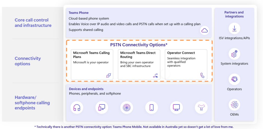 Before I finally get to my point and explain why I think Teams Phone Extensibility for Dynamics 365 Contact Center & ISV Solutions is a total game changer, over in the world of Teams what options are available to connect to the PSTN? Essentially, they boil down to three (yes technically four if you include Teams Phone Mobile – see my asterisk below):