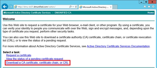 - Open a web browser to your internal CA (for example, mine’s http://dmu-dc01.dmunified.com/certsrv)