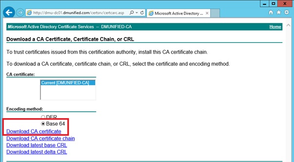 - Ensure Base 64 is selected, and click on Download CA Certificate