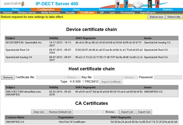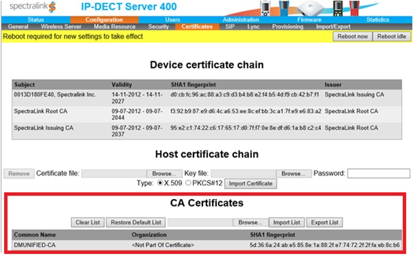 - Back on the Spectralink 400 server, open Configuration > Certificates