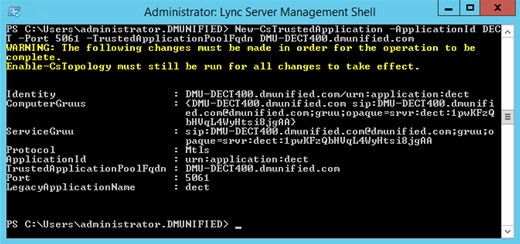 - Run New-CsTrustedApplication -ApplicationId DECT -Port 5061 -TrustedApplicationPoolFqdn DMU-DECT400.dmunified.com