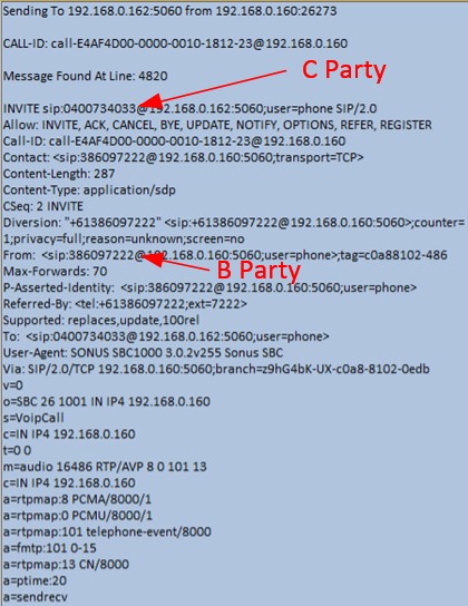 With this configuration in place, when an outbound SIP INVITE is received at the SBC with REFERRED-BY in the header, the B Party number is manipulated by the new transformation table and slotted into the Calling Number field on the outbound SIP INVITE to the ITSP. Looking at the trace below, you can see the Received Simultaneous Ring INVITE (Arrived 22) showing the A and C Party, followed by the INVITE that’s sent to the SIP Trunk Provider with the Called and Calling numbers we want: B Party and C Party: