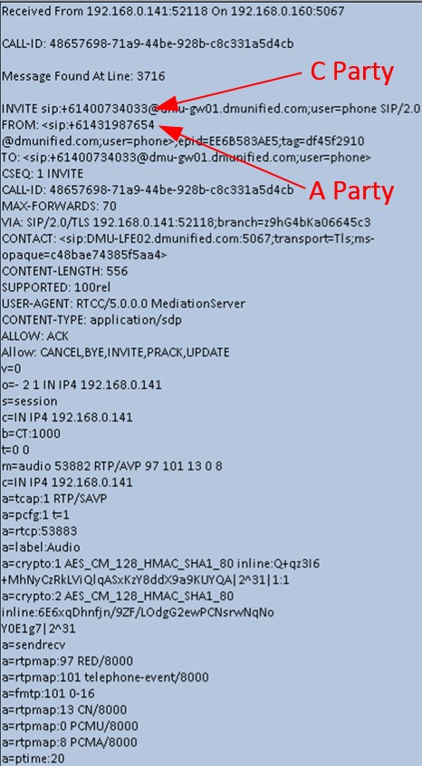 The important takeaway from this is that the B Party number (the Lync user’s number) is not present in the outbound INVITE.