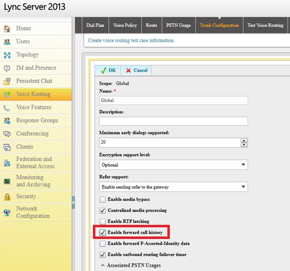 • From the Lync Control Panel, open Voice Routing > Trunk Configuration and tick Enable forward call history