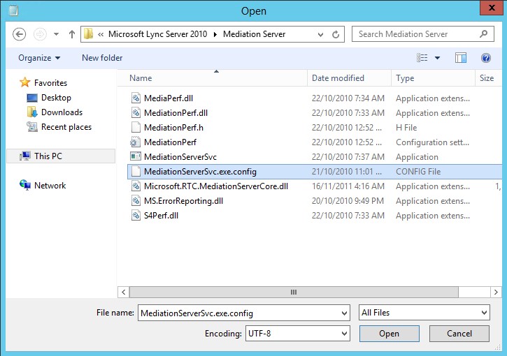 • On each Lync 2010 Server in your deployment hosting the Mediation Server role, run Notepad as an administrator and open MediationServerSVC.exe.config located in Program Files > Microsoft Lync Server 2010 > Mediation Server: