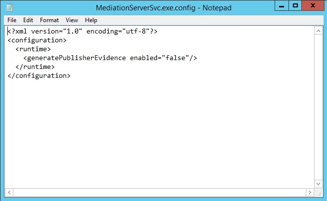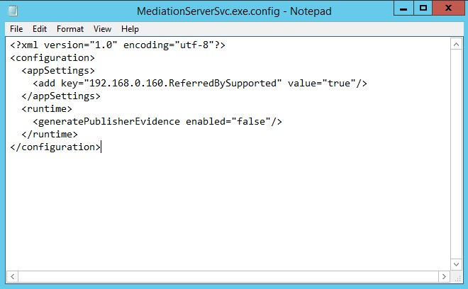 •  For the change to take effect, you’ll need to restart the Mediation service (if the service fails to start, you’ve made a mistake when editing the MediationServerSVC.exe.config file. Fix the errors, and try again):
