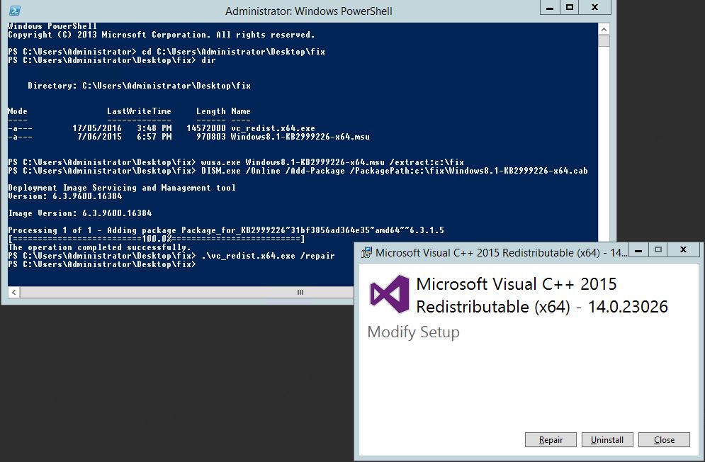 wusa.exe Windows8.1-KB2999226-x64.msu /extract:c:\fix DISM.exe /Online /Add-Package /PackagePath:c:\fix\Windows8.1-KB2999226-x64.cab .\vc_redist.x64.exe /repair