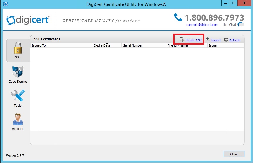 - I use Digicert’s free Certificate Utility for Windows to create CSRs (get it here). Install the tool on the server, and click on Create CSR: