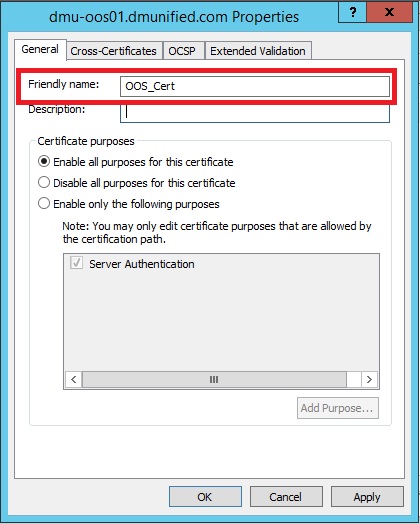 - Right-click the certificate, select Properties, and enter in a friendly name for the certificate. This is required, as the PowerShell cmdlet we use later to configure OOS refers to the certificate by its friendly name: