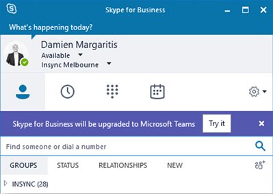 Once everything’s had time to marinate, the first thing you will notice is the Teams Upgrade notify banner that will appear in the Skype for Business client. This is the only noticeable change you’ll see SfB side: