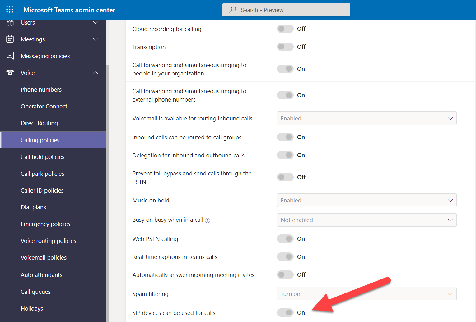 From the Teams Admin Centre, make sure the Calling Policy associated with the account that will sign in from the Poly Rove device has SIP devices can be used for calls set to On.