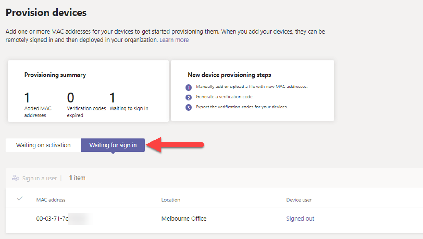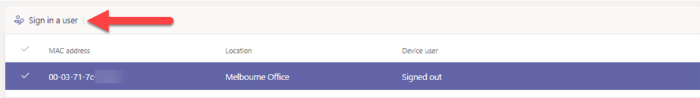 From the Teams Admin Portal, select the handset, and click on Sign in a user: