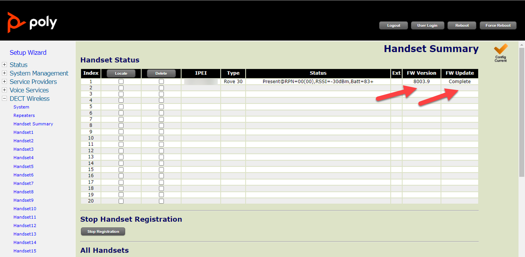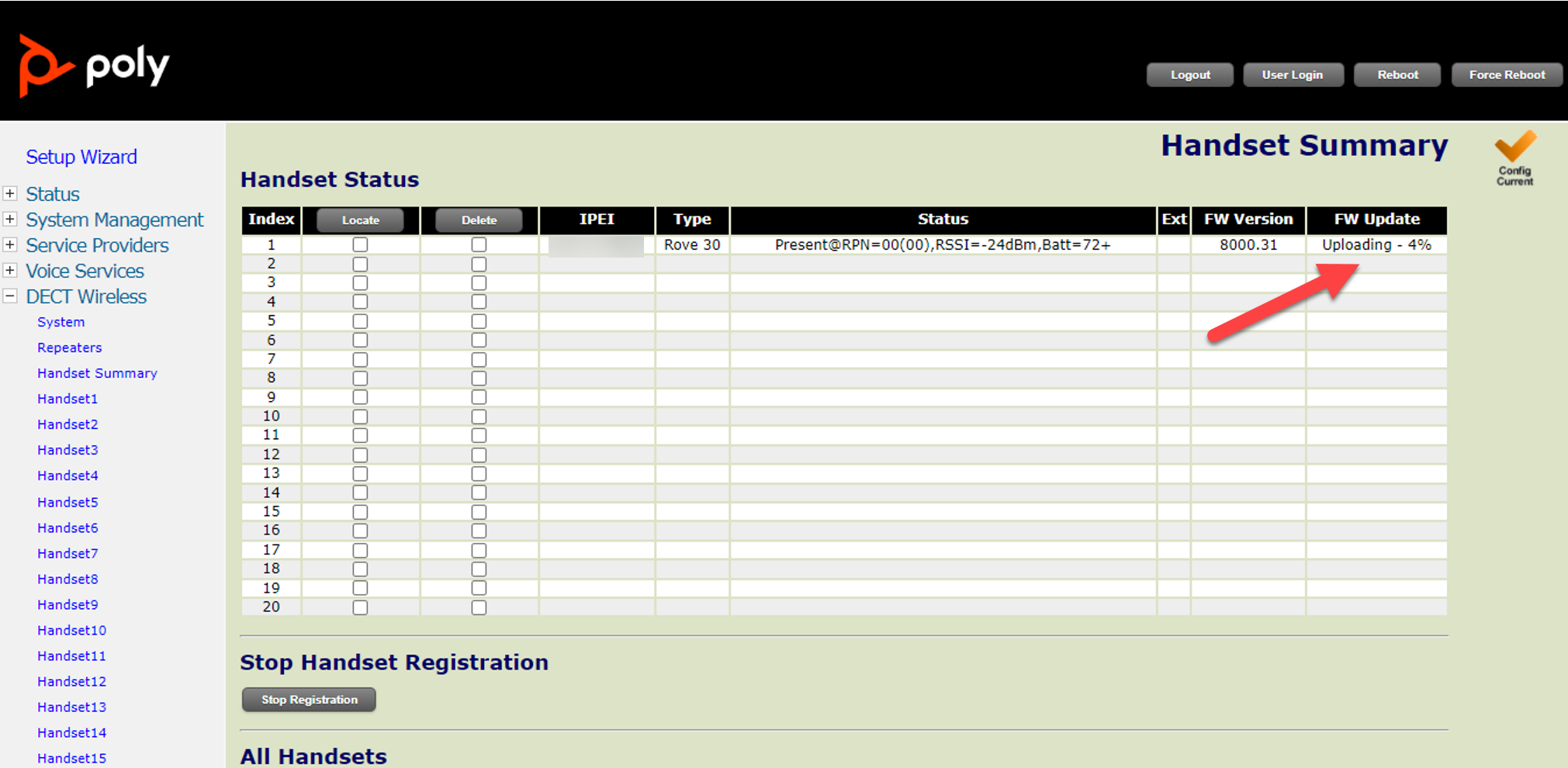 It will take sometime for both the base station and handset to update (expect up to 90 minutes). You can check and confirm the base station software version from the System Status page, and the handset from the Handset Summary page: