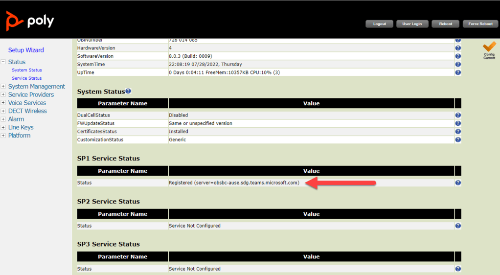 After configuring, the device will reboot, and\or reboot it yourself in order to kick off provisioning. Once complete, the device will show Microsoft Teams registration: