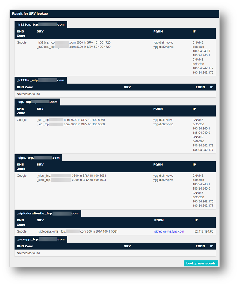 If you’re not sure if records already exist in your environment for these services (sometimes the case, or may also be old records not in use anymore), Pexip provide the following handy tool to check: https://dns.pexip.com.