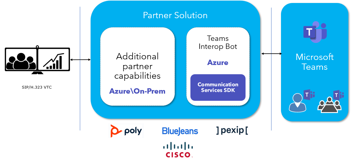 For organisations that have standardised on Microsoft Teams Room solutions, we have been able to offer interoperability between Teams and standards-based endpoints for some time: Cloud Video Interop. Cloud Video Interop (CVI) is a Microsoft Qualified third-party solution that enables third-party SIP and H.323 video room devices (VTCs) to join scheduled Microsoft Teams meetings. The architecture looks like this: